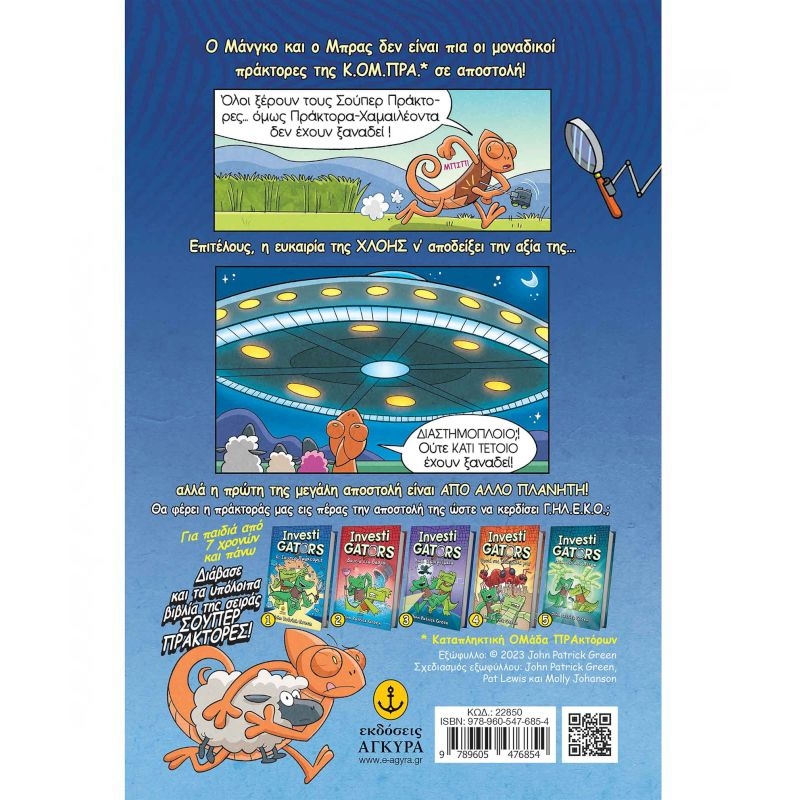 Οπαδοί των InvestiGators, µπορείτε να ΧΑΡΕΙΤΕ! Ετοιµαστείτε να βουτήξετε στον πρώτο τόµο της σειράς Οι Πράκτορες της Κ.ΟΜ.ΠΡΑ.*, που περιλαµβάνει τους περίεργους και ανατρεπτικούς συνεργάτες των αγαπηµένων σας υπερ-κατασκόπων, Mάνγκο και Μπρας! Τρία εκατοµµύρια αναγνώστες δεν µπορούν να κάνουν λάθος το σύµπαν των InvestiGators είναι γεµάτο δράση! Είμαστε στο Αρχηγείο της Κ.ΟΜ.ΠΡΑ. κι επιτέλους η Χλόη η Χαμαιλέοντας αναλαμβάνει αυτό που περίμενε μια αποστολή στην πρώτη γραμμή! Μόνο που έχει στ’ αλήθεια να κάνει με γραμμές και οι εντολές που έχει πάρει είναι τόσο ασαφείς που δεν ξέρει τι ακριβώς να ερευνήσει! Καθώς αποκαλύπτει διαμαρτυρίες προβάτων για τα εργασιακά τους δικαιώματα, μια συνωμοσία για εξωγήινη εισβολή άσε που μάλλον το εγκαταλελειμμένο φυλάκιο της Κ.ΟΜ.ΠΡΑ. είναι στοιχειωμένο– παίρνει το Γ.ΗΛ.Ε.Κ.Ο. της και γίνεται πολύτιμο μέλος της ομάδας. Ο εγκέφαλος πίσω από τους Σούπερ Πράκτορες, ο Τζον Πάτρικ Γκρην, φτιάχνει ακόμα μια διασκεδαστική ιστορία από τον κόσμο της Κ.ΟΜ.ΠΡΑ.! Το σύμπαν του Τζον Πάτρικ Γκρην, αγαπημένου συγγραφέα των παιδιών, διευρύνεται με τον πρώτο τόμο της σειράς, Οι Πράκτορες της Κ.ΟΜ.ΠΡΑ., όπου θα γνωρίσουμε τους πολύχρωμους συνεργάτες του Μάνγκο και του Μπρας. Ενώ ο Τζον δημιουργεί τις ιστορίες των Πρακτόρων σε αυτό το βιβλίο που συμπληρώνει τη σειρά, αλλά μπορεί να διαβαστεί και μόνο του, μαζί του σε αυτή τη περιπέτεια έχει τον συνδημιουργό Κρις Χέιστινγκς και τον εικονογράφο Πατ Λιούις.