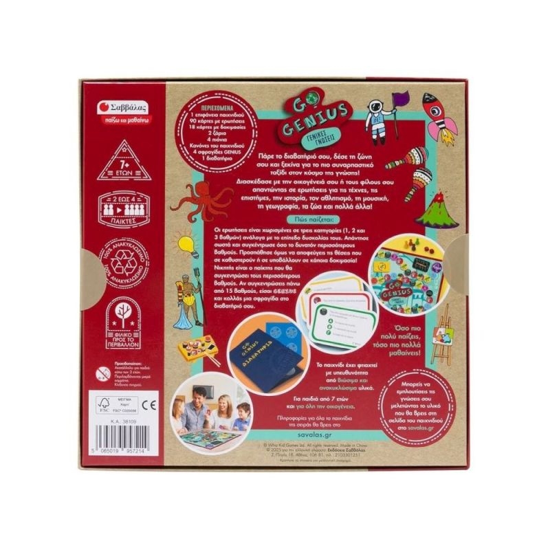 Το Go Genius: Γενικές Γνώσεις είναι το επιτραπέζιο παιχνίδι που μετατρέπει τη μάθηση σε συναρπαστική περιπέτεια! Δημιουργημένο με αγάπη και φροντίδα από τις Εκδόσεις Σαββάλας, ταξιδεύει τα παιδιά ηλικίας 7 ετών και άνω στον μαγικό κόσμο της γνώσης, μέσα από χιλιάδες έξυπνες και ποικίλες ερωτήσεις. Με θεματικές ενότητες που καλύπτουν την ιστορία, τη γεωγραφία, την επιστήμη, τις τέχνες, τον αθλητισμό και την καθημερινή ζωή, κάθε γύρος είναι μια ευκαιρία για ανακάλυψη και μάθηση μέσα από το παιχνίδι.