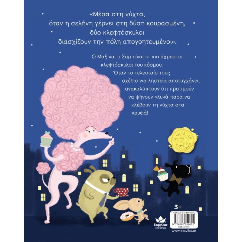 «Μέσα στη νύχτα, όταν η σελήνη γέρνει στη δύση κουρασμένη, δύο κλεφτόσκυλοι διασχίζουν την πόλη απογοητευμένοι». Ο Μαξ και ο Σαμ είναι οι πιο άχρηστοι κλεφτόσκυλοι του κόσμου. Όταν το τελευταίο τους σχέδιο για ληστεία πάει και πάλι άσχημα, ανακαλύπτουν ότι προτιμούν να ψήνουν γλυκά παρά να κλέβουν τη νύχτα στα κρυφά!