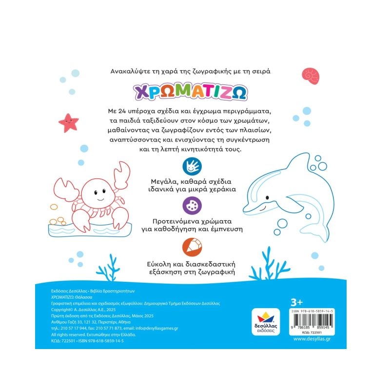 Ανακαλύψτε τη χαρά της ζωγραφικής με τη σειρά ΧΡΩΜΑΤΙΖΩ. Με 24 υπέροχα σχέδια και έγχρωμα περιγράμματα, τα παιδιά ταξιδεύουν στον κόσμο των χρωμάτων, μαθαίνοντας να ζωγραφίζουν εντός των πλαισίων, αναπτύσσοντας και ενισχύοντας τη συγκέντρωση και τη λεπτή κινητικότητά τους.