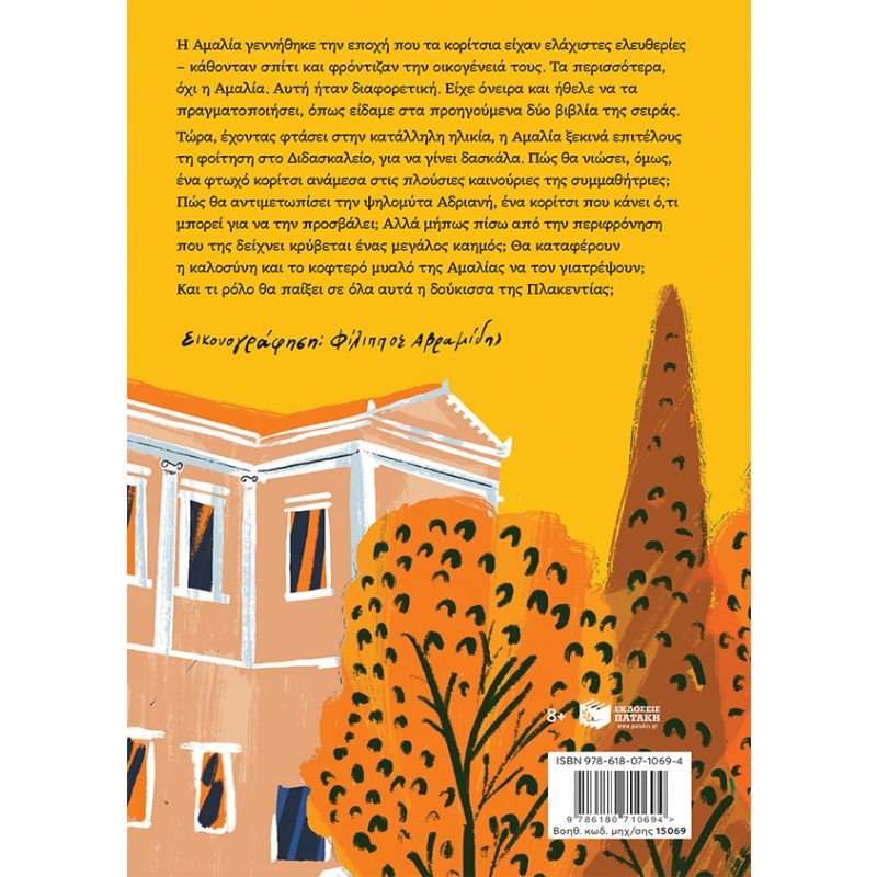 Η Αμαλία γεννήθηκε την εποχή που τα κορίτσια είχαν ελάχιστες ελευθερίες – κάθονταν σπίτι και φρόντιζαν την οικογένειά τους. Τα περισσότερα, όχι η Αμαλία. Αυτή ήταν διαφορετική. Είχε όνειρα και ήθελε να τα πραγματοποιήσει. Τώρα, έχοντας φτάσει στην κατάλληλη ηλικία, η Αμαλία ξεκινά επιτέλους τη φοίτηση στο Διδασκαλείο, για να γίνει δασκάλα. Πώς θα νιώσει, όμως, ένα φτωχό κορίτσι ανάμεσα στις πλούσιες καινούριες της συμμαθήτριες; Πώς θα αντιμετωπίσει την ψηλομύτα Αδριανή, ένα κορίτσι που κάνει ό,τι μπορεί για να την προσβάλει; Αλλά μήπως πίσω από την περιφρόνηση που της δείχνει κρύβεται ένας μεγάλος καημός; Θα καταφέρουν η καλοσύνη και το κοφτερό μυαλό της Αμαλίας να τον γιατρέψουν; Και τι ρόλο θα παίξει σε όλα αυτά η δούκισσα της Πλακεντίας; «Ήθελα να καταλάβουν τα κορίτσια ότι τα προνόμια που απολαμβάνουν σήμερα δεν τα είχαν πάντα. Τώρα όλες πάνε σχολείο. Τότε ελάχιστες μπορούσαν. Για να μορφωθεί ένα κορίτσι τον 19ο αιώνα έπρεπε να δώσει μάχη με την κοινωνία, με τους γονείς, με τα στερεότυπα που το ήθελαν κλεισμένο στο σπίτι να φροντίζει τους άλλους. Γι’ αυτό η ηρωίδα μου είναι κορίτσι. Ήθελα να καταλάβουν όλα τα σημερινά παιδιά ότι τίποτα ωραίο δε γίνεται από μόνο του. Αν επιθυμούν κάτι, πρέπει να δώσουν μάχη, όπως έδωσε η φτωχή Αμαλία από την Κυψέλη για να καταφέρει να γίνει δασκάλα. Το κοριτσάκι του 19ου αιώνα έχει τα χαρίσματα που εύχομαι όλα τα σημερινά κορίτσια να αποκτήσουν: εξυπνάδα, τόλμη, επιμονή, φαντασία και χιούμορ. Γιατί τα κορίτσια μπορούν πλέον να γίνουν δασκάλες, αλλά ακόμα και σήμερα, δύο αιώνες μετά, την ισότητα δεν την έχουν αποκτήσει ακόμα…».