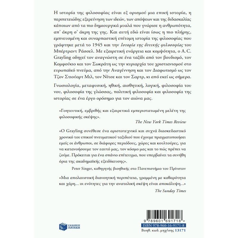 Η ιστορία της φιλοσοφίας είναι εξ ορισμού μια επική ιστορία, η περιπετειώδης εξερεύνηση των ιδεών, των απόψεων και της διδασκαλίας κάποιων από τα πιο δημιουργικά μυαλά που γνώρισε η ανθρωπότητα, απ’ άκρη σ’ άκρη της γης. Και αυτή εδώ είναι ίσως η πιο πλήρης, εμπνευσμένη και συναρπαστική επίτομη ιστορία της φιλοσοφίας που γράφτηκε μετά το 1945 και την Ιστορία της δυτικής φιλοσοφίας του Μπέρτραντ Ράσσελ. Με εξαιρετική ενάργεια και κομψότητα, ο A. C. Grayling οδηγεί τον αναγνώστη σε ένα ταξίδι από τον βουδισμό, τον Κομφούκιο και τον Σωκράτη ως την κυριαρχία του χριστιανισμού στο ευρωπαϊκό πνεύμα, από την Αναγέννηση και τον Διαφωτισμό ως τον Τζον Στιούαρτ Μιλ, τον Νίτσε και τον Σαρτρ, κι από εκεί ως σήμερα. Γνωσιολογία, μεταφυσική, ηθική, αισθητική, λογική, φιλοσοφία του νου, φιλοσοφία της γλώσσας, πολιτική φιλοσοφία και φιλοσοφία της ιστορίας σε ένα έργο ορόσημο για τον αιώνα μας. «Γοητευτική, εμβριθής και εξαιρετικά εμπεριστατωμένη μελέτη της φιλοσοφικής σκέψης». The New York Times Review. «Ο Grayling συνέθεσε ένα αριστοτεχνικό και συχνά διασκεδαστικό χρονικό του επικού πνευματικού ταξιδιού που έχουμε πραγματοποιήσει εμείς οι άνθρωποι, σε διάφορες περιόδους, χώρες και κουλτούρες, για να κατανοήσουμε τον εαυτό μας, τον κόσμο μας και το πώς πρέπει να ζούμε. Πρόκειται για ένα σπάνιο επίτευγμα, που υπερβαίνει τα συνήθη όρια της ακαδημαϊκής εξειδίκευσης». Peter Singer, καθηγητής βιοηθικής στο Πανεπιστήμιο του Πρίνστον. «Μια απολαυστική διανοητική περιπέτεια, γραμμένη με καθαρότητα και χάρη… οι ενότητες για την ανατολική σκέψη είναι αποκάλυψη…» The Sunday Times.
