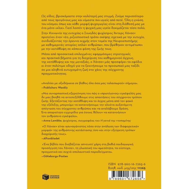 Ως είδος, βρισκόμαστε στην καλύτερή μας στιγμή. Ζούμε περισσότερο από τους προγόνους μας και είμαστε πιο υγιείς από ποτέ. Όλη η γνώση του κόσμου όπως και κάθε μορφή ψυχαγωγίας είναι στη διάθεσή μας με ένα μόνο «κλικ». Γιατί λοιπόν η ψυχική μας υγεία δοκιμάζεται τόσο πολύ; Στην «Κοινωνία της ευτυχίας» ο Σουηδός ψυχίατρος Άντερς Χάνσεν προτείνει έναν νέο, ριζοσπαστικό τρόπο σκέψης σχετικά με την ευτυχία, συνδυάζοντας την έρευνα αιχμής στον τομέα της Νευροεπιστήμης με καθημερινές ιστορίες απλών ανθρώπων, που βρέθηκαν αντιμέτωποι με την κατάθλιψη σε κάποια φάση της ζωής τους. Μέσα από προσεκτικά επιλεγμένες εφαρμόσιμες στρατηγικές και πρακτικά βήματα για τη διαχείριση του καθημερινού άγχους, της κατάθλιψης και της μοναξιάς, ο Χάνσεν μάς προσφέρει τα εφόδια κι έναν πολύτιμο οδηγό για να ξεκινήσουμε το προσωπικό μας ταξίδι σε μια αληθινά ευτυχισμένη ζωή στο χάος της σύγχρονης πραγματικότητας. «Αναλύει με οξυδέρκεια σε βάθος όλα όσα μας ταλαιπωρούν σήμερα». —Publishers Weekly. «Μια συναρπαστική εξερεύνηση του πώς ο «πρωτόγονος» εγκέφαλός μας δε μας βοηθά να αντεπεξέλθουμε στις απαιτήσεις του σύγχρονου τρόπου ζωής. Εξετάζοντας την κατάθλιψη και το άγχος μέσα από τον φακό της εξέλιξης, μπορούμε να κατανοήσουμε την ολοένα αυξανόμενη απόγνωση του σύγχρονου ανθρώπου και να αναλάβουμε δράση. Ένα απαραίτητο εγχειρίδιο για όσους θέλουν να κατανοήσουν τον ανθρώπινο εγκέφαλο». —Anna Lembke, ψυχίατρος, συγγραφέας του Η γενιά της ντοπαμίνης «Ο Χάνσεν είναι ασυναγώνιστος τόσο στην ανάλυση των διαφορετικών μορφών της ανθρώπινης κατάστασης όσο και στην εξεύρεση τρόπων διαχείρισής τους». —Aftonbladet. «Ένα βιβλίο που διαβάζεται απνευστί χάρη στη βαθιά παιδαγωγική προσέγγιση του Χάνσεν, τη γλωσσική του αμεσότητα, τα εύστοχα, πραγματικά και συχνά απολαυστικά παραδείγματα». —Göteborgs-Posten.