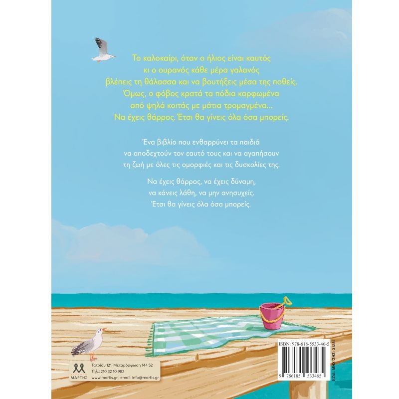 Το καλοκαίρι, όταν ο ήλιος είναι καυτός κι ο ουρανός κάθε μέρα γαλανός βλέπεις τη θάλασσα και να βουτήξεις μέσα της ποθείς. Όμως, ο φόβος κρατά τα πόδια καρφωμένα από ψηλά κοιτάς με μάτια τρομαγμένα…Να έχεις θάρρος. Έτσι θα γίνεις όλα όσα μπορείς. Ένα βιβλίο που ενθαρρύνει τα παιδιά να αποδεχτούν τον εαυτό τους και να αγαπήσουν τη ζωή με όλες τις ομορφιές και τις δυσκολίες της. Να έχεις θάρρος, να έχεις δύναμη, να κάνεις λάθη, να μην ανησυχείς. Έτσι θα γίνεις όλα όσα μπορείς.