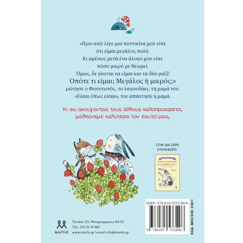 «Πριν από λίγο μια ποντικίνα μού είπε ότι είμαι μεγάλος πολύ. Κι αμέσως μετά ένα άλογο μου είπε πόσο μικρό με θεωρεί. Όμως, δε γίνεται να είμαι και τα δύο μαζί! Οπότε τι είμαι; Μεγάλος ή μικρός;» ρώτησε ο Φουντωτός, το λαγουδάκι, τη μαμά του. «Είσαι όπως είσαι», του απάντησε η μαμά. Κι αν, ακούγοντας τους άλλους καλοπροαίρετα, μαθαίναμε καλύτερα τον εαυτό μας;