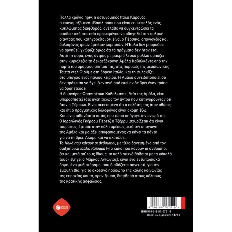 Πολλά χρόνια πριν, η αστυνομικός Ίταλα Καρούζο, η επονομαζόμενη «Βασίλισσα», επικεφαλής ενός κυκλώματος διαφθοράς, ανέλαβε να συγκεντρώσει τα αποδεικτικά στοιχεία προκειμένου να οδηγηθεί στη φυλακή ο άντρας που κατηγορούνταν ότι ήταν ο Πέρσικο, απαγωγέας και δολοφόνος τριών έφηβων κοριτσιών. Η Ίταλα δεν μπορούσε να αρνηθεί, γνώριζε όμως ότι τα πράγματα δεν ήταν έτσι. Τώρα, ένας άντρας με μακριά λευκά μαλλιά αρπάζει στην κυριολεξία τη δεκαεξάχρονη Αμάλα Καβαλκάντε από την πόρτα του όμορφου σπιτιού της, στις παρυφές της μεσαιωνικής Τσιττά ντελ Φιούμε στη βόρεια Ιταλία, και τη φυλακίζει στο υπόγειο ενός παλιού κτιρίου. Η Αμάλα συνειδητοποιεί ότι δεν πρόκειται να βγει ζωντανή από εκεί αν δε βρει έναν τρόπο να δραπετεύσει. Η δικηγόρος Φραντσέσκα Καβαλκάντε, θεία της Αμάλα, είχε υπερασπιστεί τότε ανεπιτυχώς τον άντρα που κατηγορούνταν ότι ήταν ο Πέρσικο. Είναι πεπεισμένη ότι ο πελάτης της ήταν αθώος και ότι ο πραγματικός δολοφόνος κυκλοφορεί ακόμη ελεύθερος. Και είναι πιθανότατα αυτός που έχει απαγάγει την ανιψιά της. Ο Ισραηλινός Γκέρσομ Πέρετζ ή Τζέρρυ, που ισχυρίζεται ότι είναι τουρίστας, φτάνει στην πόλη αμέσως μετά την απαγωγή της Αμάλα και μοιάζει αποφασισμένος να κάνει τα πάντα για να τη βρει. Ακόμα και να σκοτώσει. Το Κακό που κάνουν οι άνθρωποι, με τίτλο δανεισμένο από τον σαιξπηρικό Ιούλιο Καίσαρα («Το κακό που κάνουν οι άνθρωποι ζει και μετά απ’ τους ίδιους, το καλό συχνά θάβεται με τα κόκαλά τους» εξηγεί ο Μάρκος Αντώνιος), είναι ένα εντυπωσιακά δομημένο μυθιστόρημα, που διαβάζεται απνευστί, για την έμφυλη βία, για το σκοτεινό πρόσωπο της καλής κοινωνίας της επαρχίας και τη, χρονίζουσα, διαφθορά στους κόλπους της κρατικής ασφάλειας.
