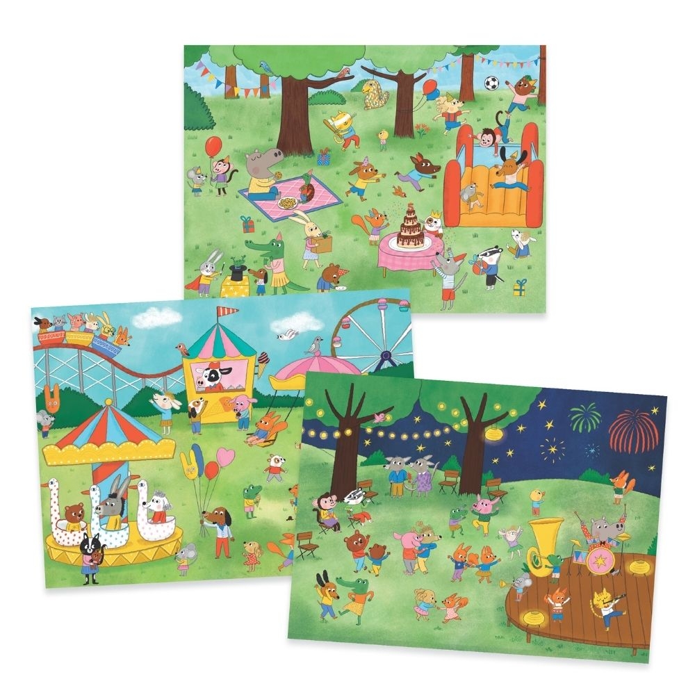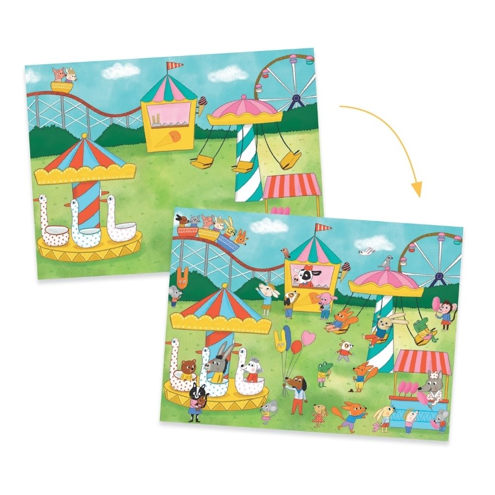 Χρησιμοποιήστε την φαντασία σας και τις χαλκομανίες της εταιρίας Djeco για να δημιουργήστε 3 ξεχωριστά σκηνικά με ζωάκια: ένα πάρτι στον κήπο, μια επίσκεψη στο λούνα παρκ ή ένα ξέφρενο βραδινό χορό! Επιλέξτε μια χαλκομανία, τοποθετήστε την όπου θέλετε πάνω στο φόντο και ξύστε την με ένα μολύβι. Όταν αφαιρέσετε την χαλκομανία, θα παρατηρήσετε πως η εικόνα έχει αποτυπωθεί στο σημείο που έχετε επιλέξει, ως δια μαγείας! Μια κλασσική, αλλά διαχρονική, δραστηριότητα που αναπτύσσει τη δημιουργικότητα των παιδιών, τη φαντασία τους και την συγκέντρωση τους.