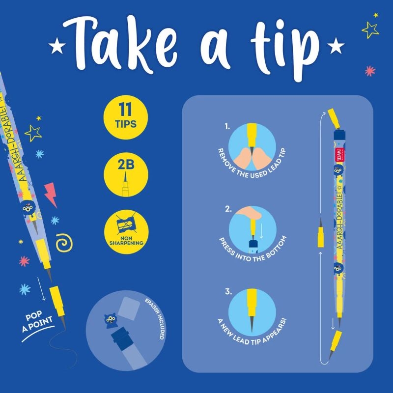 Συμφωνείς ότι δύο μολύβια είναι καλύτερα από ένα; Λοιπόν, το στοίβακτο μολύβι με γόμα - Take a Tip - Monster από τη Legami πάει ακόμα παραπέρα: διαθέτει 11 μύτες, ώστε να είναι πάντα έτοιμο για γράψιμο χωρίς ξύστρα. Πολύχρωμο, διασκεδαστικό και σούπερ πρακτικό: είναι τέλειο για παιδιά και για το σχολείο.