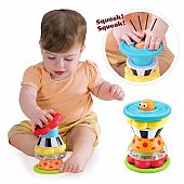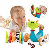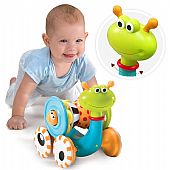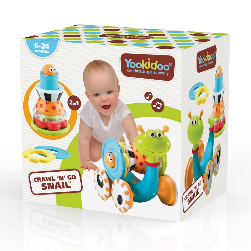 Ενθαρρύνετε το μπουσούλημα με το «Crawl 'N' Go Snail» της Yookidoo. Το σαλιγκάρι παίζει μουσική καθώς κυλά ενώ το κέλυφός του περιστρέφεται, γυρνώντας το κεφάλι του από τη μία πλευρά στην άλλη και διεγείροντας το παιδί σας να το κυνηγήσει! Αφήστε το μωρό σαν να χειριστεί το παιχνίδι με το φιλικό προς τα μικρά παιδιά κουμπί στην ουρά του σαλιγκαριού. Κάθε φορά που ενεργοποιείται, το σαλιγκάρι κυλά για περίπου 2 μέτρα και στη συνέχεια σταματά - παρακινώντας το παιδί να το ακολουθήσει ώστε να το πιάσει και να το ενεργοποιήσει ξανά, προτρέποντας παράλληλα και την εξερεύνηση του περιβάλλοντος χώρου. Ένα διασκεδαστικό παιχνίδι 2 σε 1, όταν δεν χρησιμοποιείται όπως αναφέρεται παραπάνω και το μωρό σας αποφασίζει να κάνει ένα διάλειμμα από το μπουσούλημα, αφαιρέστε τον περιστρεφόμενο δακτύλιο που σχηματίζει το κέλυφος του σαλιγκαριού και ανακαλύψτε ένα παιχνίδι στοίβαξης δαχτυλιδιών με 7 τεμάχια. Δείξτε στο παιδί σας πώς να τοποθετεί και να αφαιρεί το παιχνίδι από την πλάτη του σαλιγκαριού, πώς να στοιβάζει τους δακτυλίους και να κυλά το σαλιγκάρι. Όταν το παιδί επιχειρεί αυτές τις ενέργειες, αναπτύσσονται με τον πλέον αποτελεσματικό τρόπο οι αδρές και λεπτές κινητικές δεξιότητες του και προωθούνται οι ικανότητες επίλυσης προβλημάτων. Χρησιμοποιήστε το κουμπί on/off στο μπροστινό μέρος του σαλιγκαριού για να το απενεργοποιήσετε και να παίξετε μαζί του σε αθόρυβη λειτουργία.