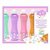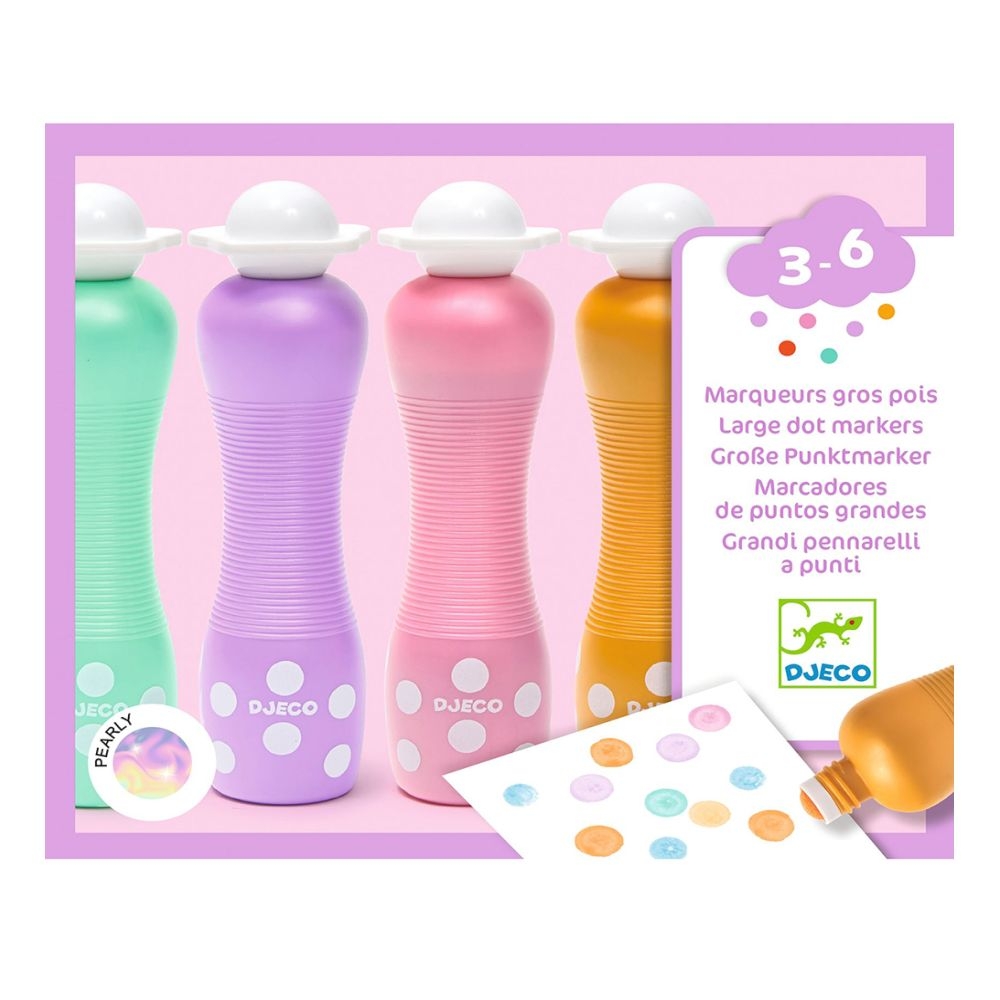 Σετ μαρκαδόρων από την εταιρεία Djeco για τα πρώτα καλλιτεχνικά βήματα των παιδιών. Αυτοί οι χοντροί μαρκαδόροι με την αφρώδη μύτη δημιουργούν εντυπωσιακές κουκκίδες με εφέ πέρλας, προσφέροντας έναν διασκεδαστικό και πρωτότυπο τρόπο για να ζωγραφίσουν και να εκφραστούν καλλιτεχνικά. Ο εργονομικός σχεδιασμός τους επιτρέπει στα μικρά χεράκια να τους κρατούν εύκολα, ενισχύοντας τη λεπτή κινητικότητα και τον έλεγχο των κινήσεων. Το μελάνι είναι υπερπλενόμενο, αποφεύγοντας λεκέδες σε ρούχα και χέρια — ιδανικό για άφοβο και δημιουργικό παιχνίδι.