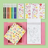 Περιλαμβάνει: 36 σελίδες ζωγραφικής με όμορφα σχέδια μπαλαρινών, 10 ποιοτικοί μαρκαδόροι και 5 φύλλα αυτοκόλλητων γεμάτα πολύχρωμα μοτίβα.