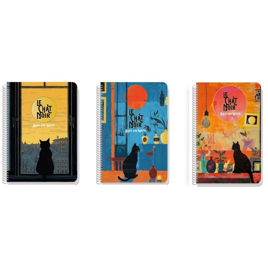 Τετράδιο σπιράλ 2 θεμάτων της σειράς Le Chat Noir από την Black&White σε 3 σχέδια. Διαθέτει εξώφυλλο από σκληρό χαρτόνι και 60 ριγέ φύλλα 70gr.
