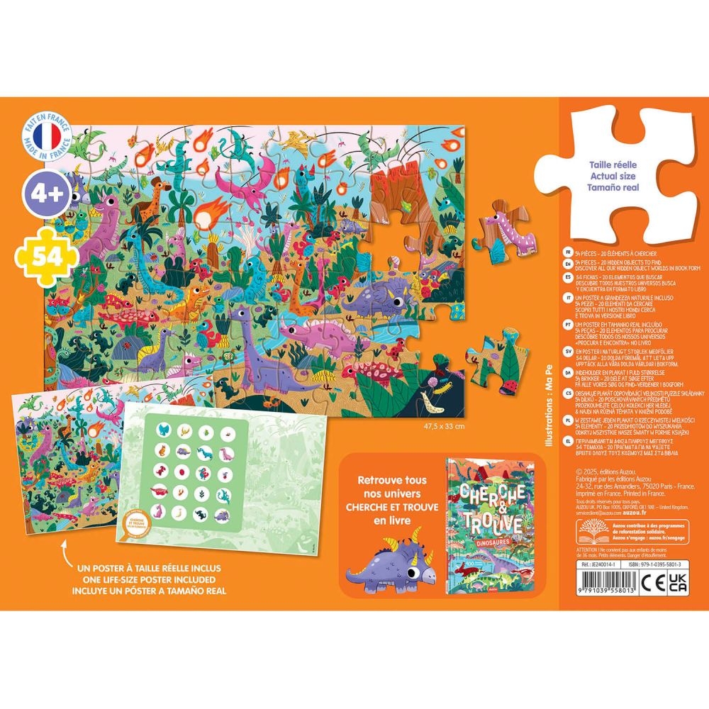 Εξερεύνησε γιγάντια προϊστορικά πλάσματα με αυτό το πολύχρωμο παζλ αναζήτησης με 54 κομμάτια! Ιδανικό για μικρούς εξερευνητές που λατρεύουν τους δεινόσαυρους. Το παζλ είναι κατασκευασμένο στη Γαλλία από υψηλής ποιότητας χαρτόνι και συνδυάζει το παιχνίδι με τη μάθηση με διασκεδαστικό τρόπο. Το παζλ συνοδεύεται από ένα αφίσα με την εικόνα του παζλ και τα στοιχεία που πρέπει να βρει το παιδί, ενισχύοντας την αλληλεπίδραση και την παρατηρητικότητα.