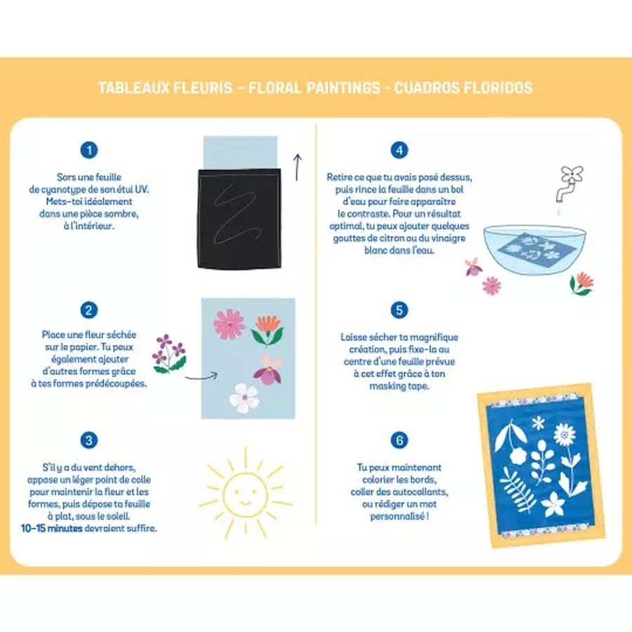 Ανακάλυψε την τέχνη της κυανοτυπίας και δημιούργησε 8 μαγευτικά ανθισμένα έργα τέχνης, συνδυάζοντας φως, φύση και φαντασία! Χρησιμοποίησε φωτοευαίσθητο χαρτί, αληθινά αποξηραμένα λουλούδια, στένσιλ, ταινίες κάλυψης και αυτοκόλλητα για να φτιάξεις μοναδικές κάρτες με το εντυπωσιακό μπλε εφέ της κυανοτυπίας – μια καλλιτεχνική τεχνική που βασίζεται στο φως του ήλιου!