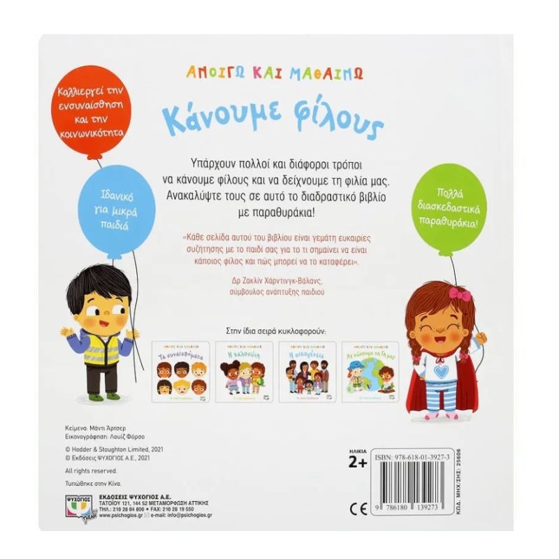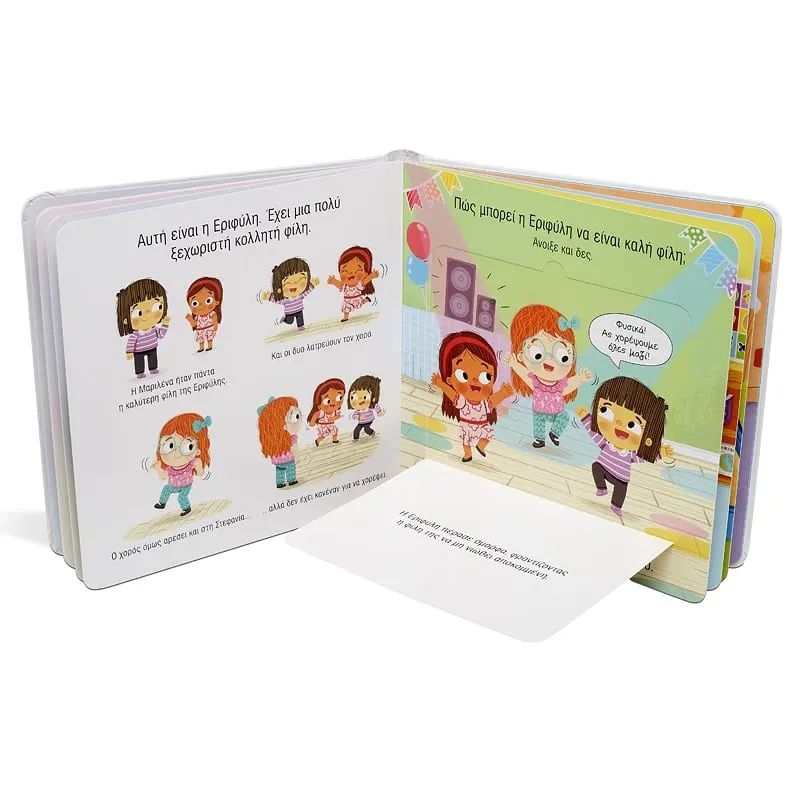 Υπάρχουν πολλοί και διάφοροι τρόποι να κάνουμε φίλους και να δείχνουμε τη φιλία μας. Ανακαλύψτε τους σε αυτό το διαδραστικό βιβλίο με παραθυράκια! «Κάθε σελίδα αυτού του βιβλίου είναι γεμάτη ευκαιρίες συζήτησης με το παιδί σας για το τι σημαίνει να είναι κάποιος φίλος και πώς μπορεί να το καταφέρει». Δρ Ζακλίν Χάρντινγκ-Βάλανς, σύμβουλος ανάπτυξης παιδιού.