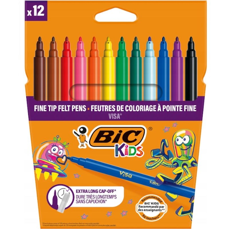 Μαρκαδόροι Bic λεπτοί, 12 χρωμάτων σε χάρτινη συσκευασία. Η μελάνη μπορεί εύκολα να αφαιρεθεί από το δέρμα & τα ρούχα πλένοντας τα με νερό. Διαθέτει αεριζόμενο καπάκι ασφαλείας και αποτελεί την τέλεια επιλογή για να αρχίσουν τα παιδάκια σας την ζωγραφική στις πρώτες ηλικίες.