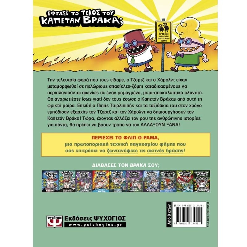 ΗΡΘΕ ΑΡΑΓΕ ΤΟ ΤΕΛΟΣ ΤΟΥ ΚΑΠΕΤΑΝ ΒΡΑΚΑ; Την τελευταία φορά που τους είδαμε, ο Τζορτζ και ο Χάρολντ είχαν μεταμορφωθεί σε πελώριους σπασίκλες-ζόμπι, καταδικασμένους να περιπλανιούνται αιωνίως σε έναν ρημαγμένο, μετα-αποκαλυπτικό πλανήτη. Θα αναρωτιέστε ίσως γιατί δεν τους έσωσε ο Καπετάν Βράκας από αυτή τη φρικτή μοίρα. Επειδή ο Πιπής Τσιρλιπιπής και τα ταξιδάκια του στον χρόνο εμπόδισαν εξαρχής τον Τζορτζ και τον Χάρολντ να δημιουργήσουν τον Καπετάν Βράκα! Τώρα, έχοντας αλλάξει τον ρου της ανθρώπινης ιστορίας για πάντα, θα πρέπει να βρουν τρόπο να τον ΑΛΛΑΞΟΥΝ ΞΑΝΑ! ΠΕΡΙΕΧΕΙ ΤΟ ΦΛΙΠ-Ο-ΡΑΜΑ, μια πρωτοποριακή τεχνική παγκοσμίου φήμης που σας επιτρέπει να ζωντανέψετε τις σκηνές δράσης!