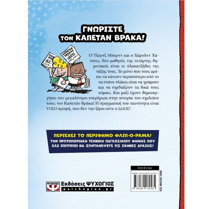 ΓΝΩΡΙΣΤΕ ΤΟΝ ΚΑΠΕΤΑΝ ΒΡΑΚΑ! Ο Τζορτζ Μπερντ και ο Χάρολντ Χάτσινς, δύο μαθητές της τετάρτης δημοτικού, είναι οι πλακατζήδες της τάξης τους. Το μόνο που τους αρέσει να κάνουν περισσότερο από το να σπάνε πλάκες είναι να γράφουν και να σχεδιάζουν τα δικά τους κόμικς. Και μαζί έχουν δημιουργήσει τον μεγαλύτερο υπερήρωα στην ιστορία του σχολείου τους: τον Καπετάν Βράκα! Η πραγματική του ταυτότητα είναι ΤΟΣΟ κρυφή, που δεν την ξέρει ούτε ο ΙΔΙΟΣ! ΠΕΡΙΕΧΕΙ ΤΟ ΠΕΡΙΦΗΜΟ ΦΛΙΠ-Ο-ΡΑΜΑ! ΤΗΝ ΠΡΩΤΟΠΟΡΙΑΚΗ ΤΕΧΝΙΚΗ ΠΑΓΚΟΣΜΙΟΥ ΦΗΜΗΣ ΠΟΥ ΣΑΣ ΕΠΙΤΡΕΠΕΙ ΝΑ ΖΩΝΤΑΝΕΨΕΤΕ ΤΙΣ ΣΚΗΝΕΣ ΔΡΑΣΗΣ!
