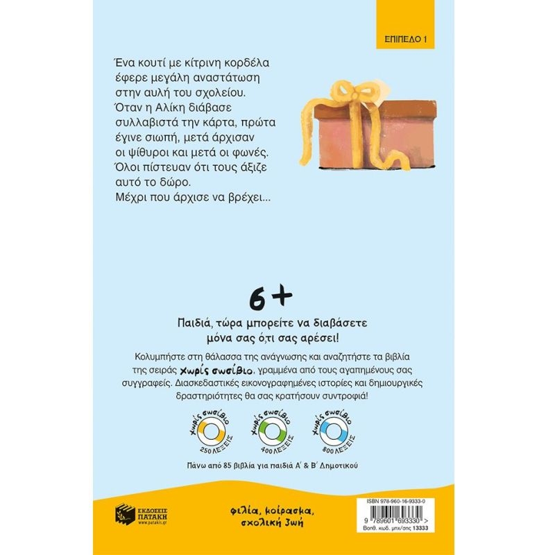 Ένα κουτί με κίτρινη κορδέλα έφερε μεγάλη αναστάτωση στην αυλή του σχολείου. Όταν η Αλίκη διάβασε συλλαβιστά την κάρτα, πρώτα έγινε σιωπή, μετά άρχισαν οι ψίθυροι και μετά οι φωνές. Όλοι πίστευαν ότι τους άξιζε αυτό το δώρο. Μέχρι που άρχισε να βρέχει…