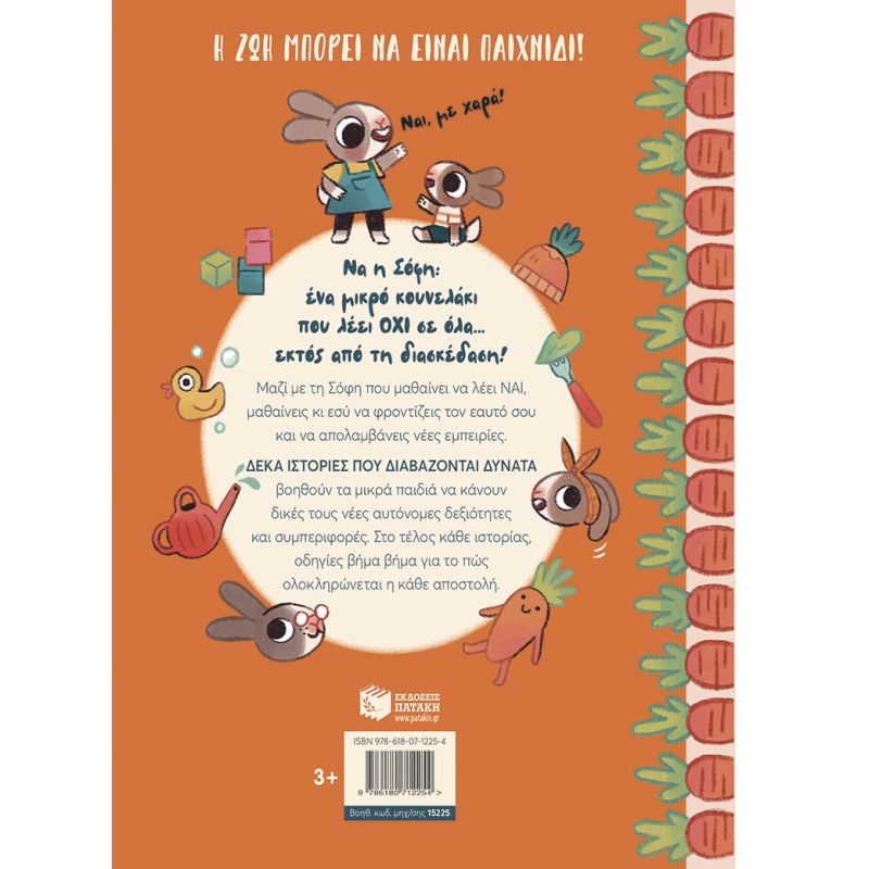 Η ζωή μπορεί να είναι παιχνίδι! Η Σόφη είναι ένα μικρό κουνελάκι που λέει ΟΧΙ σε όλα… εκτός από τη διασκέδαση! Δες πώς η Σόφη μαθαίνει να λέει ΝΑΙ, σ’ ένα βιβλίο που βοηθά να φροντίζεις τον εαυτό σου και να απολαμβάνεις νέες εμπειρίες. Δέκα ιστορίες που διαβάζονται δυνατά ενθαρρύνουν τα μικρά παιδιά να υιοθετήσουν νέες, αυτόνομες δεξιότητες και συμπεριφορές. Στο τέλος κάθε ιστορίας, οδηγίες βήμα-βήμα για το πώς ολοκληρώνεται η κάθε αποστολή.