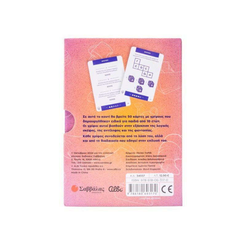 Σε αυτό το κουτί θα βρείτε 50 κάρτες με γρίφους που δημιουργήθηκαν ειδικά για παιδιά από 10 ετών. Οι γρίφοι αυτοί βοηθούν στην εξάσκηση της λογικής σκέψης, της αντίληψης και της φαντασίας. Κάθε γρίφος συνοδεύεται από τη λύση του, αλλά και από τη διαδικασία που οδηγεί στην επίλυσή του.