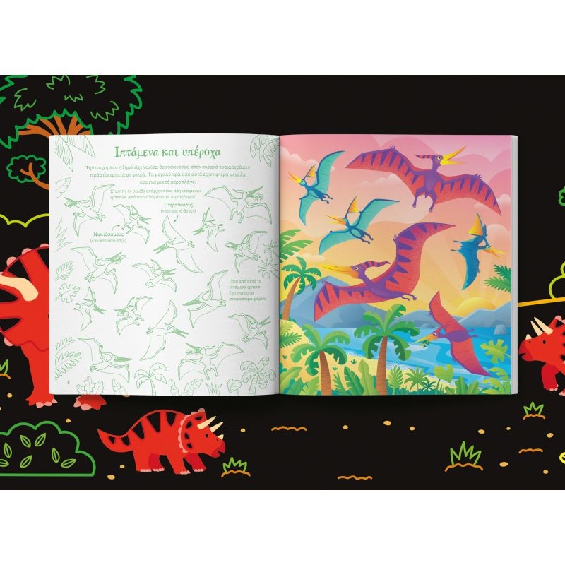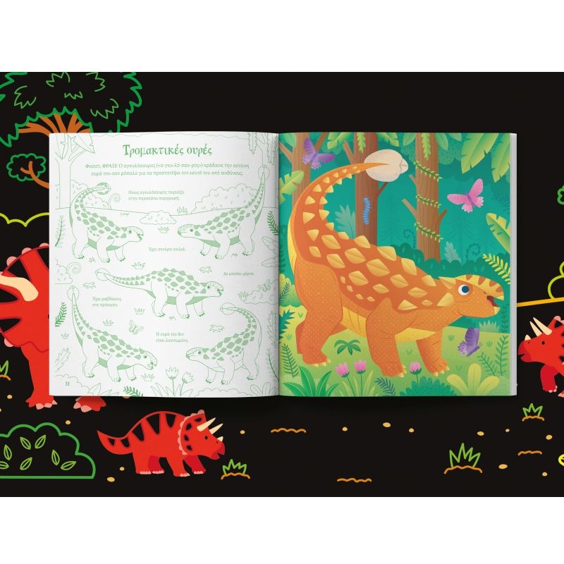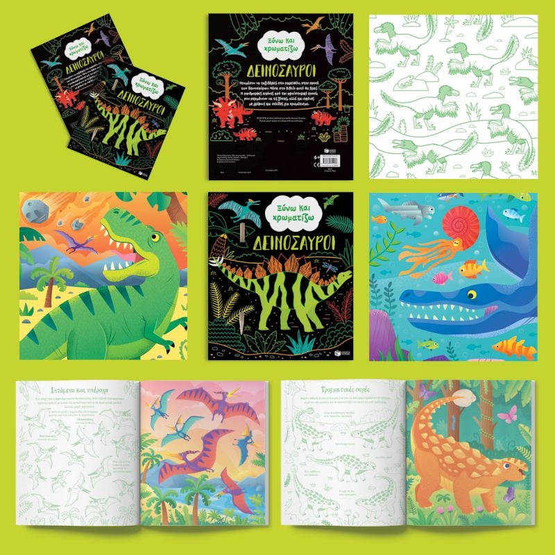Ετοιμάσου να ταξιδέψειs στο παρελθόν, στην εποχή των δεινοσαύρων. Μέσα στο βιβλίο αυτό θα βρειs 11 πανέμορφεs εικόνεs από την προϊστορική εποχή, που περιμένουν να τιs ξύσειs, αλλά και εικόνεs με γρίφουs και σελίδεs για χρωμάτισμα.