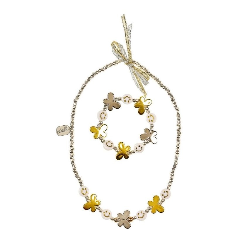 Ένα υπέροχο σετ κοσμημάτων για μικρές πριγκίπισσες από 3 ετών και άνω! Το σετ περιλαμβάνει κολιέ με χάντρες, με χρυσές πεταλουδίτσες και στρόγγυλες smile φατσούλες καθώς και ασορτί ελαστικό βραχιολάκι. Το κολιέ εφαρμόζει απαλά στον λαιμό, ενώ το βραχιολάκι ταιριάζει εύκολα με διάφορες εμφανίσεις, προσθέτοντας λάμψη και φαντασία.