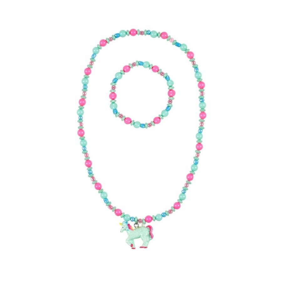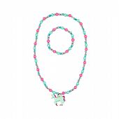 Ένα μαγικό σετ κοσμημάτων για μικρές ονειροπόλες! Το σετ Aike περιλαμβάνει ένα κολιέ και ένα ασορτί ελαστικό βραχιολάκι σε ροζ και mint green αποχρώσεις, διακοσμημένα με πολύχρωμες χάντρες και ένα χαριτωμένο μονόκερο.
