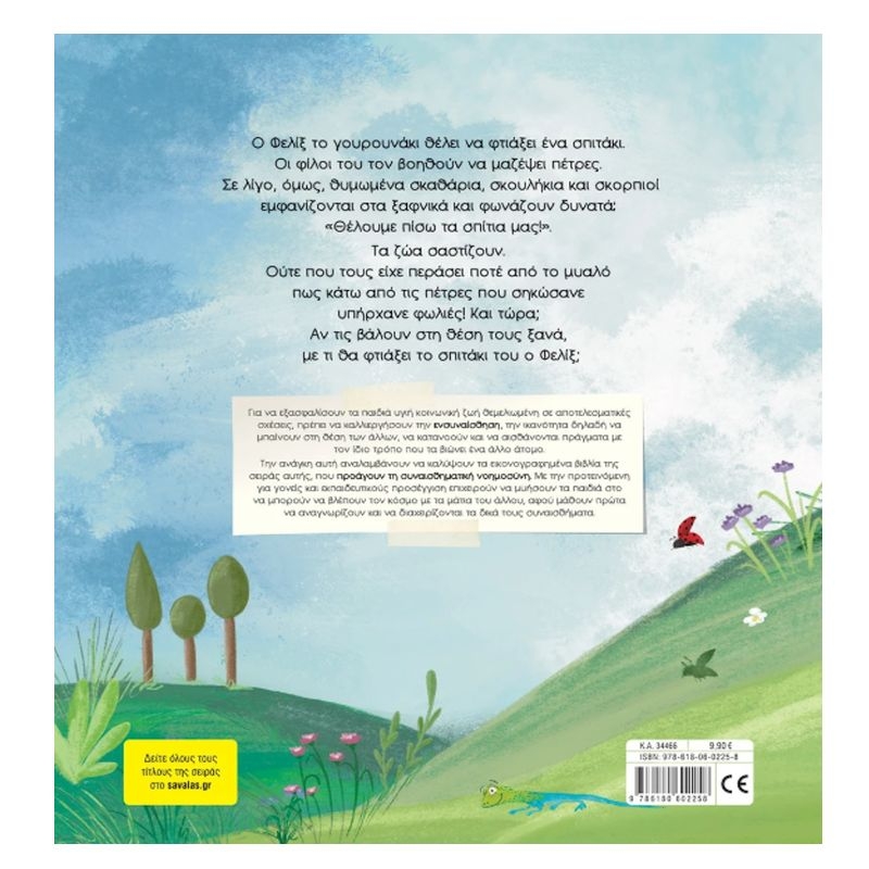 Ο Φέλιξ το γουρουνάκι θέλει να φτιάξει ένα σπιτάκι. Οι φίλοι του τον βοηθούν να μαζέψει πέτρες. Σε λίγο, όμως, θυμωμένα σκαθάρια, σκουλήκια και σκορπιοί εμφανίζονται στα ξαφνικά και φωνάζουν δυνατά: «Θέλουμε πίσω τα σπίτια μας!». Τα ζώα σαστίζουν. Ούτε που τους πέρασε ποτέ από το μυαλό πως κάτω από τις πέτρες που σηκώσανε υπήρχανε φωλιές! Και τώρα; Αν τις βάλουν στη θέση τους ξανά, με τι θα φτιάξει το σπιτάκι του ο Φέλιξ;