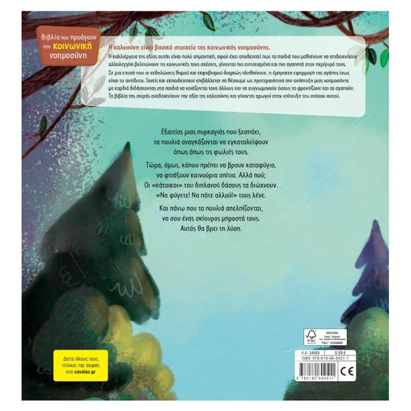 Εξαιτίας μια πυρκαγιάς που ξεσπάει, τα πουλιά αναγκάζονται να εγκαταλείψουν όπως όπως τις φωλιές τους. Τώρα, όμως, κάπου πρέπει να βρουν καταφύγιο, να φτιάξουν καινούρια σπίτια. Αλλά πού; Οι «κάτοικοι» του διπλανού δάσους τα διώχνουν. «Να φύγετε! Να πάτε αλλού!» τους λένε. Και πάνω που τα πουλιά απελπίζονται, να σου ένας σκίουρος μπροστά τους. Αυτός θα βρει τη λύση.