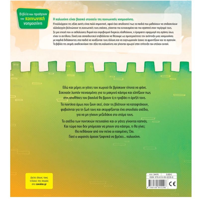 Εδώ και μέρες οι γάτες του χωριού δε βρίσκουν τίποτα να φάνε. Ξεκινούν λοιπόν πεινασμένες για το μακρινό κάστρο και ελπίζουν πως στις αποθήκες του βασιλιά θα βρουν ό,τι τραβάει η όρεξή τους. Τα ποντίκια όμως που ζουν εκεί, όταν τις βλέπουν να καταφτάνουν, φοβούνται για τη ζωή τους και σκαρφίζονται ένα σπουδαίο σχέδιο, για να μη γίνουν μεζεδάκια στο στόμα τους. Το σχέδιο των ποντικιών πετυχαίνει και οι γάτες γίνονται καπνός. Και τώρα που δεν μπόρεσαν να μπουν στο κάστρο, τι θα γίνει; Θα πεθάνουν από την πείνα οι καημένες; Όχι. Γιατί ο ουρανός αρχίζει ξαφνικά να βρέχει… καλοσύνη.