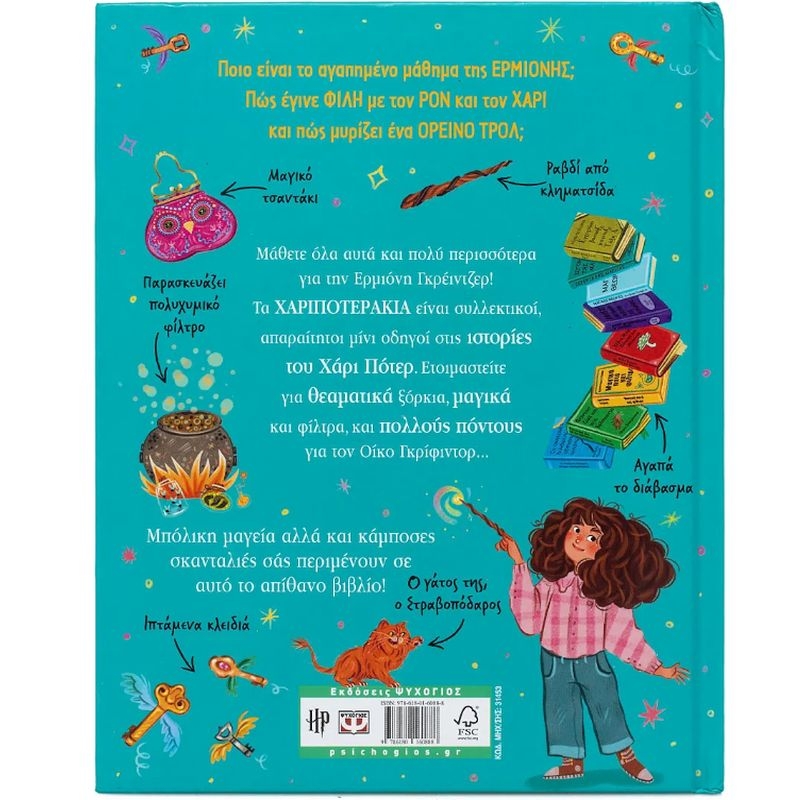 Ποιο είναι το αγαπημένο μάθημα της ΕΡΜΙΟΝΗΣ; Πώς έγινε ΦΙΛΗ με τον ΡΟΝ και τον ΧΑΡΙ και πώς μυρίζει ένα ΟΡΕΙΝΟ ΤΡΟΛ; Μάθετε όλα αυτά και πολύ περισσότερα για την Ερμιόνη Γκρέιντζερ! Τα ΧΑΡΙΠΟΤΕΡΑΚΙΑ είναι συλλεκτικοί, απαραίτητοι μίνι οδηγοί στις ιστορίες του Χάρι Πότερ. Ετοιμαστείτε για θεαματικά ξόρκια, μαγικά και φίλτρα, και πολλούς πόντους για τον Οίκο Γκρίφιντορ...Μπόλικη μαγεία αλλά και κάμποσες σκανταλιές σάς περιμένουν σε αυτό το απίθανο βιβλίο!