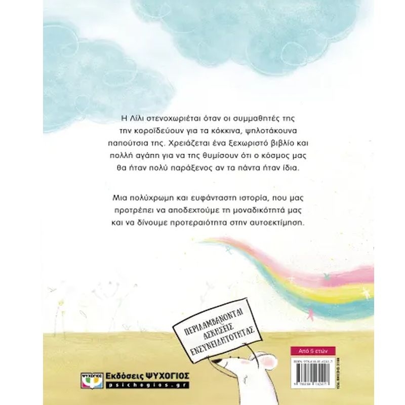 Η Λίλι στενοχωριέται όταν οι συμμαθητές της την κοροϊδεύουν για τα κόκκινα, ψηλοτάκουνα παπούτσια της. Χρειάζεται ένα ξεχωριστό βιβλίο και πολλή αγάπη για να της θυμίσουν ότι ο κόσμος μας θα ήταν πολύ παράξενος αν τα πάντα ήταν ίδια. Μια πολύχρωμη και ευφάνταστη ιστορία, που μας προτρέπει να αποδεχτούμε τη μοναδικότητά μας και να δίνουμε προτεραιότητα στην αυτοεκτίμηση. Περιλαμβάνονται ασκήσεις ενσυνειδητότητας.
