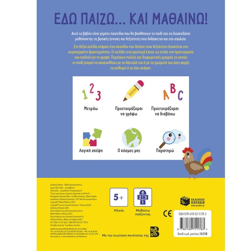 Αυτό το βιβλίο είναι γεμάτο παιχνίδια που θα βοηθήσουν το παιδί σας να διασκεδάσει μαθαίνοντας τις βασικές έννοιες και δεξιότητες που διδάσκεται και στο σχολείο. Στη δεξιά σελίδα υπάρχει ένα εικονίδιο που δείχνει ποια δεξιότητα εξασκείται στη συγκεκριμένη δραστηριότητα. Οι σελίδες στα αριστερά έχουν ως στόχο την προετοιμασία του παιδιού για τη γραφή. Περιέχουν πολλές και διαφορετικές γραμμές τις οποίες το παιδί μπορεί να ακολουθήσει με το δάχτυλό του ή με τα χρώματά του όσες φορές το επιθυμεί ή το έχει ανάγκη.