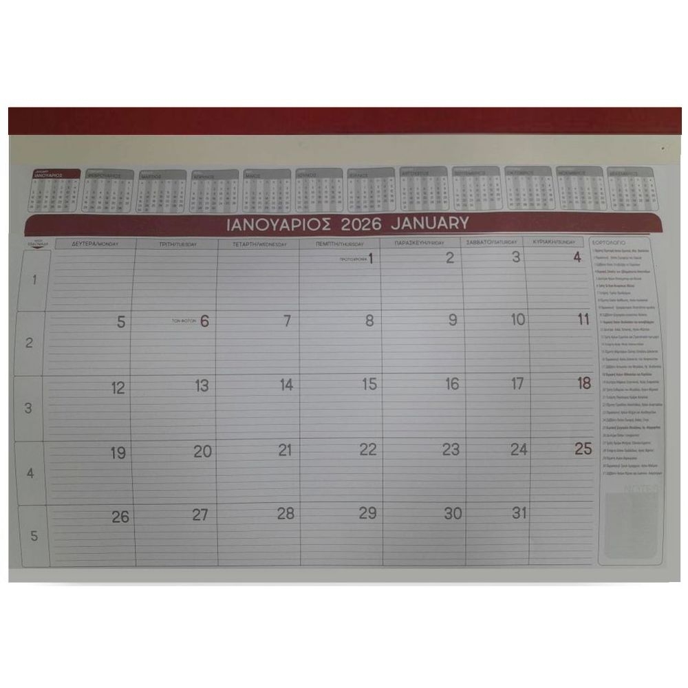 Αυτό το μηνιαίο ημερολόγιο είναι σχεδιασμένο ειδικά για τη χρήση σε γραφεία και επαγγελματικά περιβάλλοντα και προσφέρει πολλές χρήσιμες λειτουργίες. Η μεγάλη διάσταση του, 35×50 εκατοστά, προσφέρει αρκετό χώρο για να σημειώσετε τις σημαντικές σας υποχρεώσεις, συναντήσεις, προθεσμίες και άλλες εκδηλώσεις. Κάθε μήνας είναι αναγραμμένος σε ξεχωριστή σελίδα, δίνοντάς σας την δυνατότητα να προγραμματίσετε τις δραστηριότητές σας με αναλυτικό τρόπο. Το ημερολόγιο αυτό είναι ένα αξιόπιστο εργαλείο για τη διαχείριση του χρόνου και των υποχρεώσεών σας, και θα σας βοηθήσει να παραμείνετε οργανωμένοι καθ’ όλο το έτος 2026.