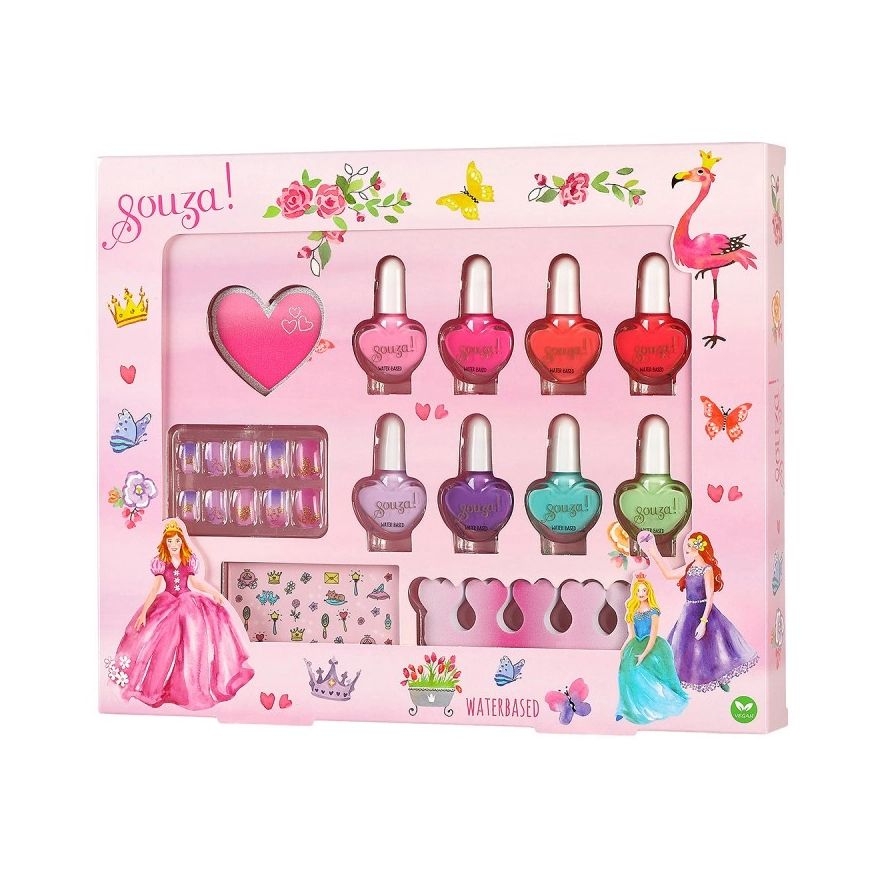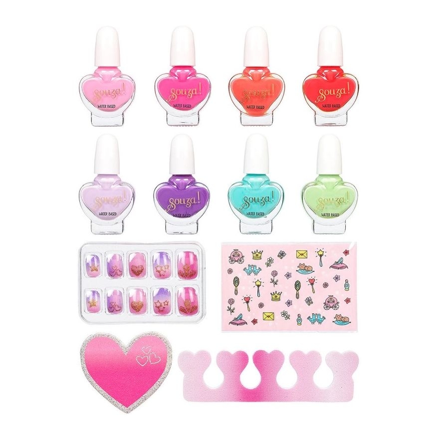 Μικρές πριγκίπισσες μπορούν τώρα να δημιουργήσουν μοναδικά nail look με αυτό το σετ βερνικιών και αξεσουάρ από τη Souza! Τα βερνίκια είναι 100% vegan, δερματολογικά ελεγμένα και βασισμένα στο νερό, δημιουργούν peel-off στρώση και αφαιρούνται εύκολα σαν αυτοκόλλητα, χωρίς να προκαλούν ερεθισμούς. Ιδανικό για παιδικά πάρτυ, παιχνίδι σε σαλόνι ομορφιάς ή ως δώρο. Το σετ συσκευάζεται σε χαριτωμένο κουτί με παράθυρο και σχέδιο πριγκίπισσας. Ένα σετ που συνδυάζει φαντασία, δημιουργικότητα και απόλυτη ασφάλεια, ιδανικό για μικρές fashionistas!