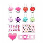 Περιλαμβάνει: 8 μπουκαλάκια βερνικιού (5 ml το καθένα) σε υπέροχες αποχρώσεις: ροζ, φούξια, κοραλί, κόκκινο, λιλά, μωβ, τιρκουάζ και ανοιχτό πράσινο, αυτοκόλλητα νυχιών με σχέδια πριγκίπισσας, tips, separator για δάχτυλα και πινελάκι-καρδιά.