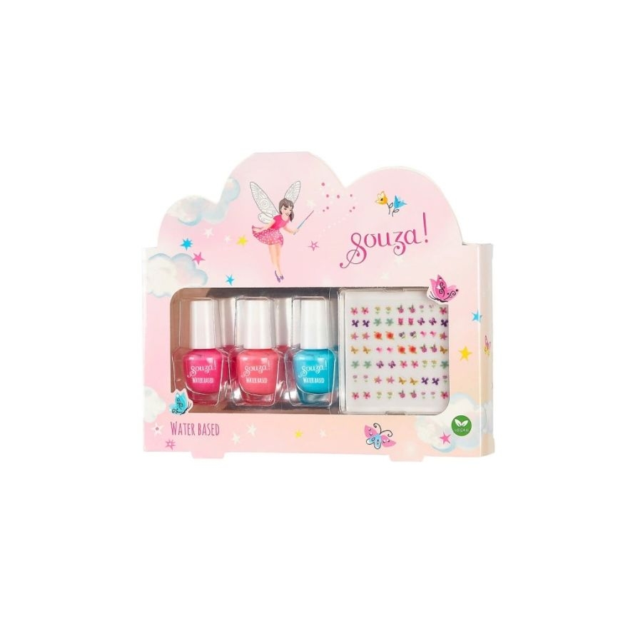 Μικρές λάτρεις της ομορφιάς μπορούν να δημιουργήσουν μαγικά, πολύχρωμα μανικιούρ με αυτό το σετ βερνικιών νυχιών για παιδιά από την Ολλανδική μάρκα Souza! Όλα τα καλλυντικά Souza! είναι 100% vegan, δερματολογικά ελεγμένα και με βάση το νερό, για να είναι απολύτως ασφαλή για την παιδική επιδερμίδα. Τα βερνίκια σχηματίζουν στρώμα peel-off, ώστε να αφαιρούνται εύκολα σαν αυτοκόλλητα, χωρίς ασετόν. Ιδανικό για παιδικά πάρτι, γενέθλια, παιχνίδι σε σαλόνι ομορφιάς ή ως δώρο. Συσκευάζεται σε χαριτωμένο κουτί με παράθυρο, ιδανικό για δώρο.