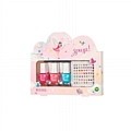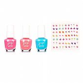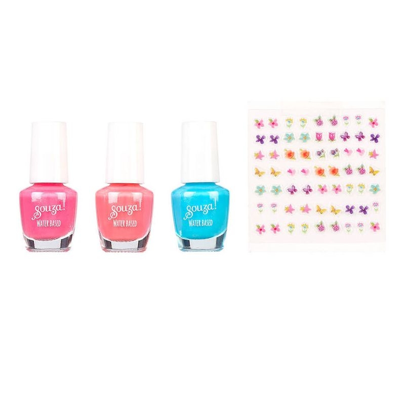 Περιλαμβάνει: 3 βερνίκια νυχιών σε ροζ, 1 πορτοκαλί απόχρωση και τιρκουάζ καθώς και Φύλλο με 63 μικρά αυτοκόλλητα νυχιών σε σχέδια λουλουδιών και πεταλούδων.