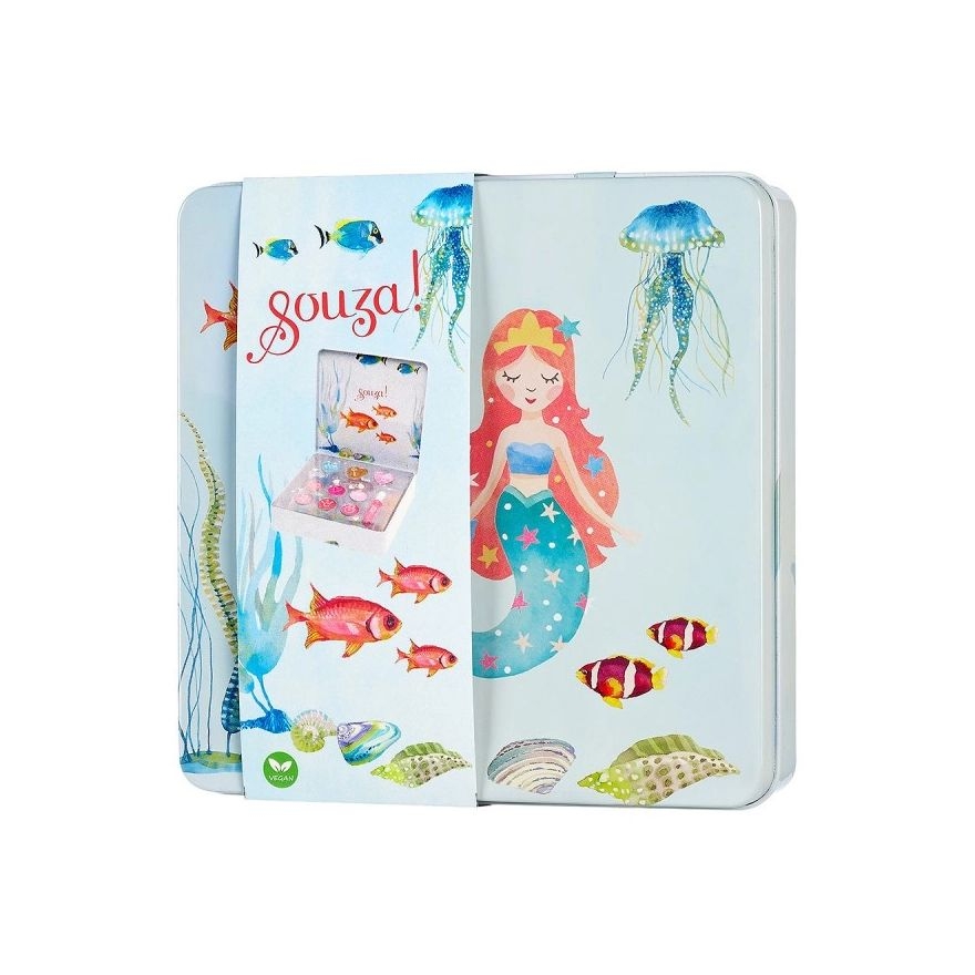 Μπες στον μαγικό κόσμο της ομορφιάς με το σετ μακιγιάζ για παιδιά “Mermaid” από την Ολλανδική μάρκα Souza! Τα καλλυντικά είναι με βάση το νερό και φυσικά μέταλλα, δερματολογικά ελεγμένα, 100% vegan, μη αλλεργιογόνα και ασφαλή για την παιδική επιδερμίδα. Αφαιρούνται εύκολα με ζεστό νερό και σαπούνι, χωρίς να χρειάζονται ειδικά προϊόντα. Η κασετίνα, διακοσμημένη με γοργόνες, ψαράκια και θαλάσσια σχέδια, είναι ιδανική για παιδικά πάρτι, παιχνίδι σε σαλόνι ομορφιάς ή ως μοναδικό δώρο για μικρές θαυμάστριες της φαντασίας. Εξερεύνησε τον μαγικό κόσμο της Souza! – όπου το παιχνίδι, το στυλ και η φαντασία συναντιούνται!