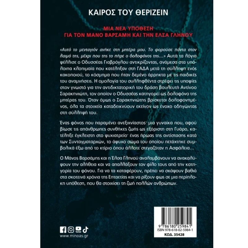 Αυτό το μενταγιόν ανήκε στη μητέρα μου. Το φορούσε πάντα στον λαιμό της, μέχρι που της το πήρε ο δολοφόνος της…» Αυτά τα λόγια ψέλλισε ο Οδυσσέας Γιαβρόγλου αντικρίζοντας, ανάμεσα στα υπόλοιπα κλοπιμαία που κατέληξαν στη ΓΑΔΑ μετά τη σύλληψη ενός κακοποιού, το κόσμημα που ήταν δεμένο άρρηκτα με τις παιδικές του αναμνήσεις. Η ομολογία του συλληφθέντα στρέφει τις υποψίες στον γνωστό για την αντιδικτατορική του δράση βουλευτή Αντίνοο Σαρακηνιώτη, τον οποίον ο Οδυσσέας κατηγορεί ως δολοφόνο της μητέρας του. Όταν όμως ο Σαρακηνιώτης βρίσκεται δολοφονημένος, όλα τα στοιχεία καταδεικνύουν εκείνον ως ένοχο οδηγώντας στη σύλληψή του. Ένας φόνος που παραμένει ανεξιχνίαστος· μια γυναίκα που, αφού βίωσε τις απάνθρωπες συνθήκες ζωής ως εξόριστη στη Γυάρο, κατέληξε έγκλειστη στο ψυχιατρείο· ένας ήρωας της αντίστασης κατά των Συνταγματαρχών, το άψυχο σώμα του οποίου πετάχτηκε συμβολικά έξω από το κτίριο όπου άλλοτε στεγαζόταν η Ασφάλεια… Ο Μάνος Βαρσάμης και η Έλσα Γληνού αναλαμβάνουν να ανακαλύψουν την αλήθεια και να απαλλάξουν τον φίλο τους από την κατηγορία του φόνου. Για να τα καταφέρουν, πρέπει να σκάψουν βαθιά στα σκοτεινά χρόνια της Επταετίας και να ρίξουν φως σε μια περίπλοκη υπόθεση, που θα στοιχίσει τη ζωή πολλών ανθρώπων.