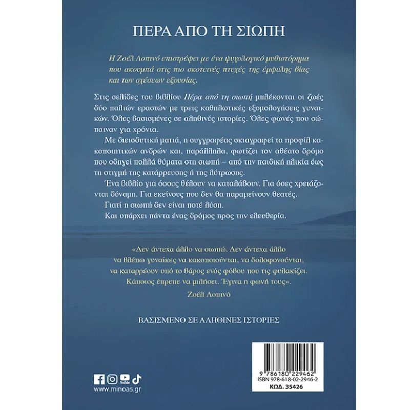 Η Ζοέλ Λοπινό επιστρέφει με ένα ψυχολογικό μυθιστόρημα που ακουμπά στις πιο σκοτεινές πτυχές της έμφυλης βίας και των σχέσεων εξουσίας. Στις σελίδες του βιβλίου Πέρα από τη σιωπή μπλέκονται οι ζωές δύο παλιών εραστών με τρεις καθηλωτικές εξομολογήσεις γυναικών. Όλες βασισμένες σε αληθινές ιστορίες. Όλες φωνές που σώπαιναν για χρόνια. Με διεισδυτική ματιά, η συγγραφέας σκιαγραφεί τα προφίλ κακοποιητικών ανδρών και, παράλληλα, φωτίζει τον αθέατο δρόμο που οδηγεί πολλά θύματα στη σιωπή – από την παιδική ηλικία έως τη στιγμή της κατάρρευσης ή της λύτρωσης. Ένα βιβλίο για όσους θέλουν να καταλάβουν. Για όσες χρειάζονται δύναμη. Για εκείνους που δεν θα παραμείνουν θεατές. Γιατί η σιωπή δεν είναι ποτέ λύση. Και υπάρχει πάντα ένας δρόμος προς την ελευθερία.