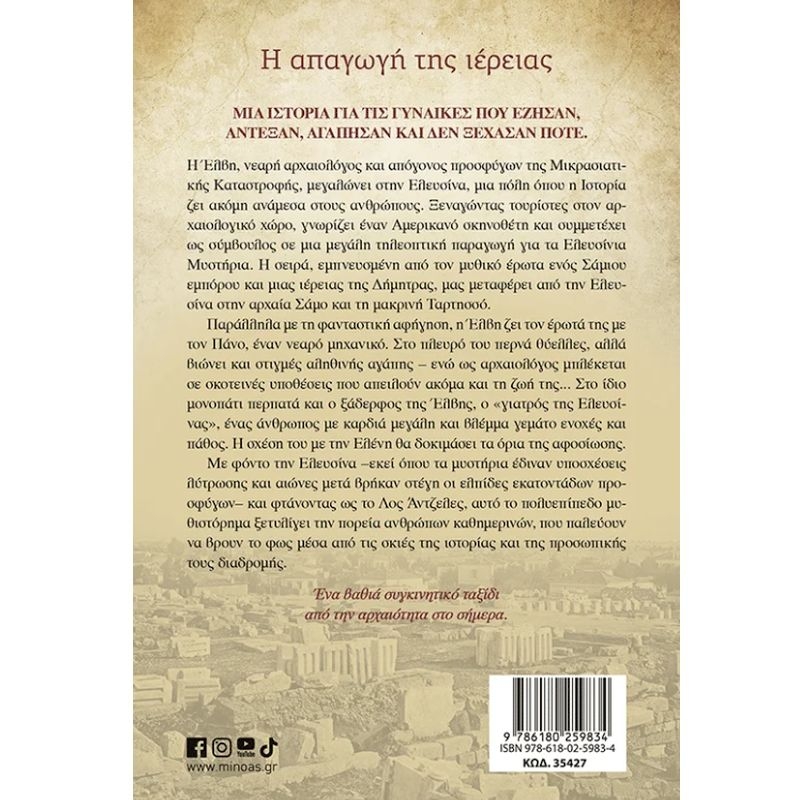 Μια ιστορία για τις γυναίκες που έζησαν, άντεξαν, αγάπησαν και δεν ξέχασαν ποτέ. Η Έλβη, νεαρή αρχαιολόγος και απόγονος προσφύγων της Μικρασιατικής Καταστροφής, μεγαλώνει στην Ελευσίνα, μια πόλη όπου η Ιστορία ζει ακόμη ανάμεσα στους ανθρώπους. Ξεναγώντας τουρίστες στον αρχαιολογικό χώρο, γνωρίζει έναν Αμερικανό σκηνοθέτη και συμμετέχει ως σύμβουλος σε μια μεγάλη τηλεοπτική παραγωγή για τα Ελευσίνια Μυστήρια. Η σειρά, εμπνευσμένη από τον μυθικό έρωτα ενός Σάμιου εμπόρου και μιας ιέρειας της Δήμητρας, μας μεταφέρει από την Ελευσίνα στην αρχαία Σάμο και τη μακρινή Ταρτησσό. Παράλληλα με τη φανταστική αφήγηση, η Έλβη ζει τον έρωτά της με τον Πάνο, έναν νεαρό μηχανικό. Στο πλευρό του περνά θύελλες, αλλά βιώνει και στιγμές αληθινής αγάπης, ενώ ως αρχαιολόγος μπλέκεται σε σκοτεινές υποθέσεις που απειλούν ακόμα και τη ζωή της... Στο ίδιο μονοπάτι περπατά και ο ξάδερφος της Έλβης, ο «γιατρός της Ελευσίνας», ένας άνθρωπος με καρδιά μεγάλη και βλέμμα γεμάτο ενοχές και πάθος. Η σχέση του με την Ελένη θα δοκιμάσει τα όρια της αφοσίωσης. Με φόντο την Ελευσίνα εκεί όπου τα μυστήρια έδιναν υποσχέσεις λύτρωσης και αιώνες μετά βρήκαν στέγη οι ελπίδες εκατοντάδων προσφύγων και φτάνοντας ως το Λος Άντζελες, αυτό το πολυ-επίπεδο μυθιστόρημα ξετυλίγει την πορεία ανθρώπων καθημερινών, που παλεύουν να βρουν το φως μέσα από τις σκιές της ιστορίας και της προσωπικής τους διαδρομής. Ένα βαθιά συγκινητικό ταξίδι από την αρχαιότητα στο σήμερα.