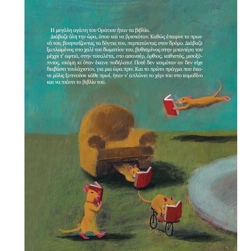 Ο Οράτιος δεν είναι ένας συνηθισμένος ποντικός. Το πάθος του είναι τα βιβλία. Το όνειρό του; Να γίνει ο ποντικός της γνώσης. Διαβάζει συνέχεια και παντού… προς μεγάλη απογοήτευση των γονιών του, που έχουν αρχίσει ν’ ανησυχούν. «Θα κουραστείς και θα τυφλωθείς! Σταμάτα να διαβάζεις!» του φωνάζουν όλη την ώρα. Μέχρι που μια μέρα συμβαίνει κάτι τρομερό. Ο πατέρας του, πάνω στην απελπισία του, του παίρνει όλα τα βιβλία και τα κλειδώνει σ’ ένα μπαούλο. Χωρίς τα βιβλία του ο Οράτιος βαριέται αφόρητα… Ώσπου μια μέρα βλέπει απροσδόκητα μια μικρή αγγελία που θα του αλλάξει τη ζωή.