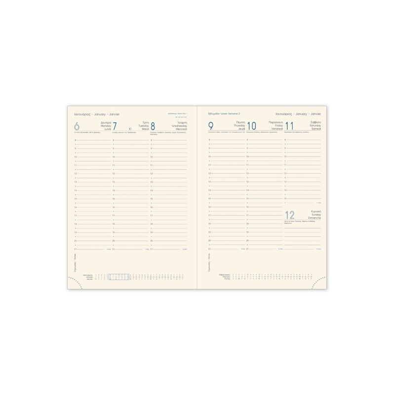 Ημερολόγιο εβδομαδιαίο με χειροποίητη και εύκαμπτη βιβλιοδεσία, στρογγυλεμένες γωνίες, λαστιχάκι και pen loop. Περιλαμβάνεται φάκελος εγγράφων στο πίσω μέρος του βιβλίου.