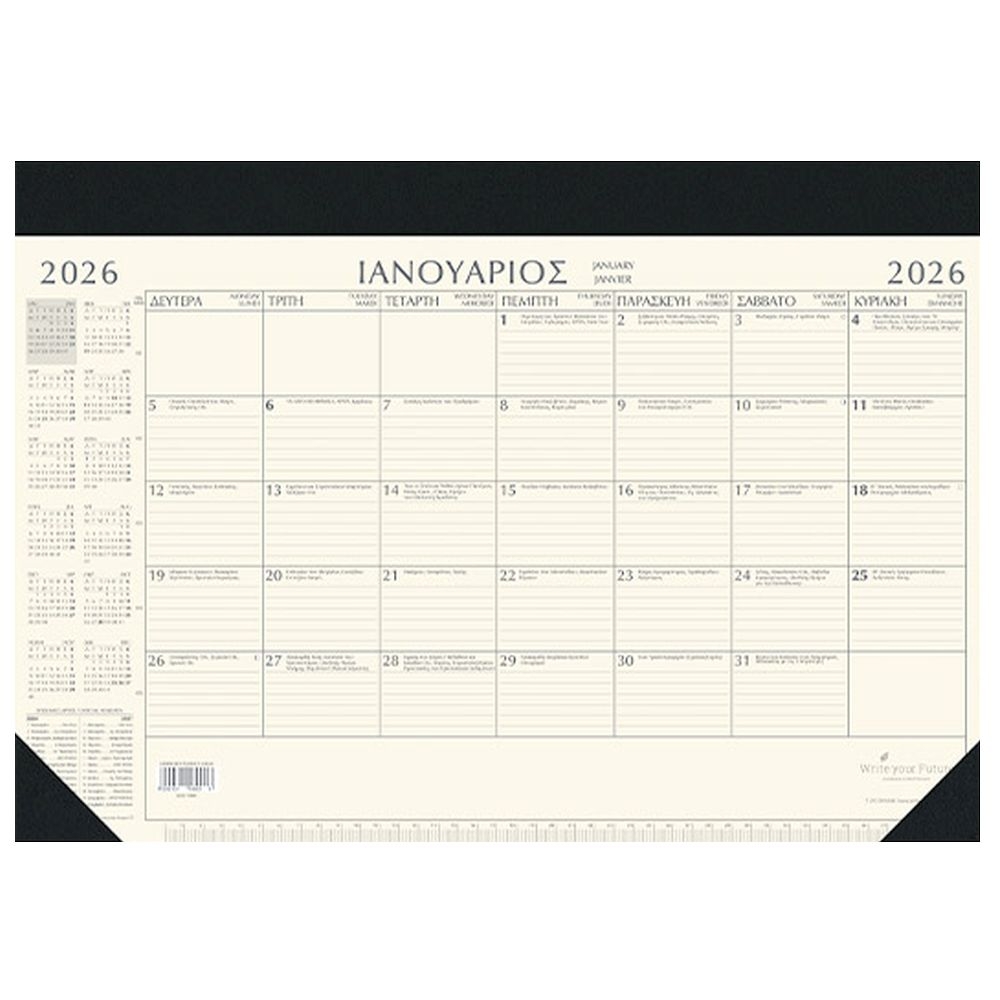 Αυτό το μηνιαίο ημερολόγιο είναι σχεδιασμένο ειδικά για τη χρήση σε γραφεία και επαγγελματικά περιβάλλοντα και προσφέρει πολλές χρήσιμες λειτουργίες. Η μεγάλη διάσταση του, 35×50 εκατοστά, προσφέρει αρκετό χώρο για να σημειώσετε τις σημαντικές σας υποχρεώσεις, συναντήσεις, προθεσμίες και άλλες εκδηλώσεις. Κάθε μήνας είναι αναγραμμένος σε ξεχωριστή σελίδα, δίνοντάς σας την δυνατότητα να προγραμματίσετε τις δραστηριότητές σας με αναλυτικό τρόπο. Το ημερολόγιο αυτό είναι ένα αξιόπιστο εργαλείο για τη διαχείριση του χρόνου και των υποχρεώσεών σας, και θα σας βοηθήσει να παραμείνετε οργανωμένοι καθ’ όλο το έτος 2026.