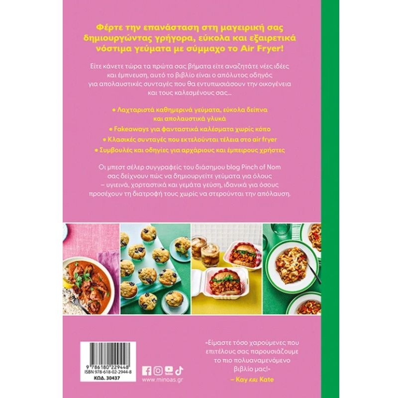 Φέρτε την επανάσταση στη μαγειρική σας δημιουργώντας γρήγορα, εύκολα και εξαιρετικά νόστιμα γεύματα με σύμμαχο το Air Fryer! Είτε κάνετε τώρα τα πρώτα σας βήματα είτε αναζητάτε νέες ιδέες και έμπνευση, αυτό το βιβλίο είναι ο απόλυτος οδηγός για απολαυστικές συνταγές που θα εντυπωσιάσουν την οικογένεια και τους καλεσμένους σας… ● Λαχταριστά καθημερινά γεύματα, εύκολα δείπνα και απολαυστικά γλυκά ● Fakeaways για φανταστικά καλέσματα χωρίς κόπο ● Κλασικές συνταγές που εκτελούνται τέλεια στο air fryer ● Συμβουλές και οδηγίες για αρχάριους και έμπειρους χρήστες Οι μπεστ σέλερ συγγραφείς του διάσημου blog Pinch of Nom σας δείχνουν πώς να δημιουργείτε γεύματα για όλους υγιεινά, χορταστικά και γεμάτα γεύση, ιδανικά για όσους προσέχουν τη διατροφή τους χωρίς να στερούνται την απόλαυση.