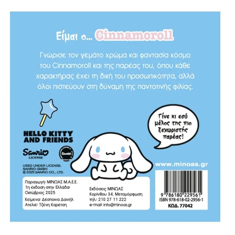 Γνώρισε τον γεμάτο χρώμα και φαντασία κόσμο του Cinnamoroll και της παρέας του, όπου κάθε χαρακτήρας έχει τη δική του προσωπικότητα, αλλά όλοι πιστεύουν στη δύναμη της παντοτινής φιλίας.