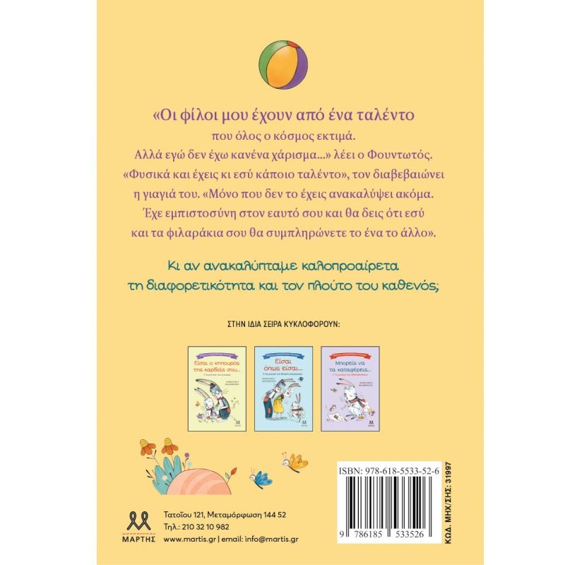 Οι φίλοι μου έχουν από ένα ταλέντο που όλος ο κόσμος εκτιμά. Αλλά εγώ δεν έχω κανένα χάρισμα…» λέει ο Φουντωτός. «Φυσικά και έχεις κι εσύ κάποιο ταλέντο», τον διαβεβαιώνει η γιαγιά του. «Μόνο που δεν το έχεις ανακαλύψει ακόμα. Έχε εμπιστοσύνη στον εαυτό σου και θα δεις ότι εσύ και τα φιλαράκια σου θα συμπληρώνετε το ένα το άλλο». Κι αν ανακαλύπταμε καλοπροαίρετα τη διαφορετικότητα και τον πλούτο του καθενός;