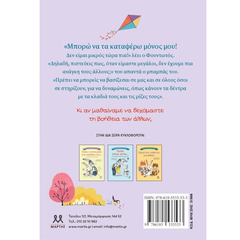 «Μπορώ να τα καταφέρω μόνος μου! Δεν είμαι μικρός τώρα πια!» λέει ο Φουντωτός. «Δηλαδή, πιστεύεις πως, όταν είμαστε μεγάλοι, δεν έχουμε πια ανάγκη τους άλλους;» του απαντά ο μπαμπάς του. «Πρέπει να μπορείς να βασίζεσαι σε μας και σε όλους όσοι σε στηρίζουν, για να δυναμώνεις, όπως κάνουν τα δέντρα με τα κλαδιά τους και τις ρίζες τους». Κι αν μαθαίναμε να δεχόμαστε τη βοήθεια των άλλων;